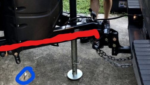 Now that the trailer isn’t going anywhere we can disconnect from the tow vehicle. I start by lowering the tongue jack until it makes contact with the ground. You might need to use some blocking or a weight distribution plate depending on your site. Here we are on a concrete pad, so none of that was needed. Once I have made just the barest of contact I pull the pins on my load distribution system (inside the blue circles) and begin jacking the front of the trailer up while still connected to the tow vehicle. This takes the weight/tension off the weight distribution arms (in red) so that we can safely remove them.