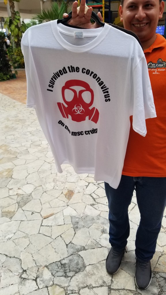 The next morning we wake up to the landscape of Cozumel, Mexico, and the site of Mexican officials arguing with our crew on the gangplank. We soon learned from our new trusted source at the lounge that there are two people sick with the flu on the boat, one a crewmember and one a passenger. They each need a COVID-19 test before we will be allowed to disembark. The testing process at this time takes 24 hours, so we’re not getting off this boat anytime soon. The Captain eventually announces that we will be extending our stay in Mexico for another day and cancelling our last stop, MSC’s private island in the Bahamas altogether.